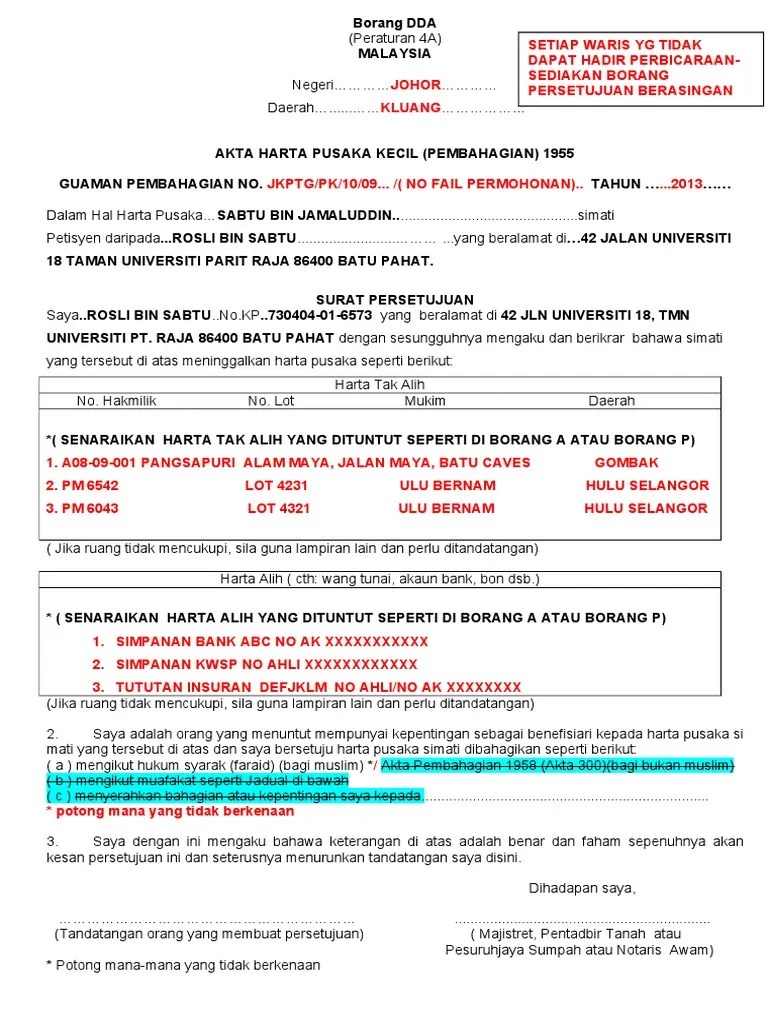 I) maklumat am pejabat pendaftar hakmilik melibatkan pendaftaran perintah mahkamah yang dikeluarkan oleh mahkamah tinggi (grant of probet dan letter of. Satu (1) salinan borang a yang lengkap di isi dan. Panduan mengisi borang surat persetujuan harta pusaka kecil d.d.a. Moshims contoh borang f harta pusaka kecil to download moshims contoh borang f harta pusaka kecil just right click and save image as. Borang a hendaklah dikemukakan kepada unit pembahagian pusaka kecil berserta dengan dokumen yang berikut: Pdf prosedur permohonan surat kuasa tadbir di unit pusaka kecil jkptg khairunnas al qassam academia edu. Borang permohonan ( borang a ) boleh didapati di unit pembahagian pusaka kecil atau pejabat tanah daerah Dec 21, 2016admin109 commentsfaraidfaraid, faraidh, harta pusaka, pembahagian harta. Kes terakhir iaitu kes md isa bin sabar. Harta pusaka harta pusaka.kenapa ada yang bersengketa kerananya? Harta itu terdiri daripada harta tak alih (tanah/rumah) sahaja, atau ; Dalam perintah pelantikan pentadbir (borang f), selalunya unit pembahagian pusaka kecil akan melampirkan senarai waris yang berhak atas harta si mati bersama bahagian mereka, sama ada mengikut persetujuan muafakat, atau mengikut kiraan faraid. Dokumen yang perlu dikemukakan 1.