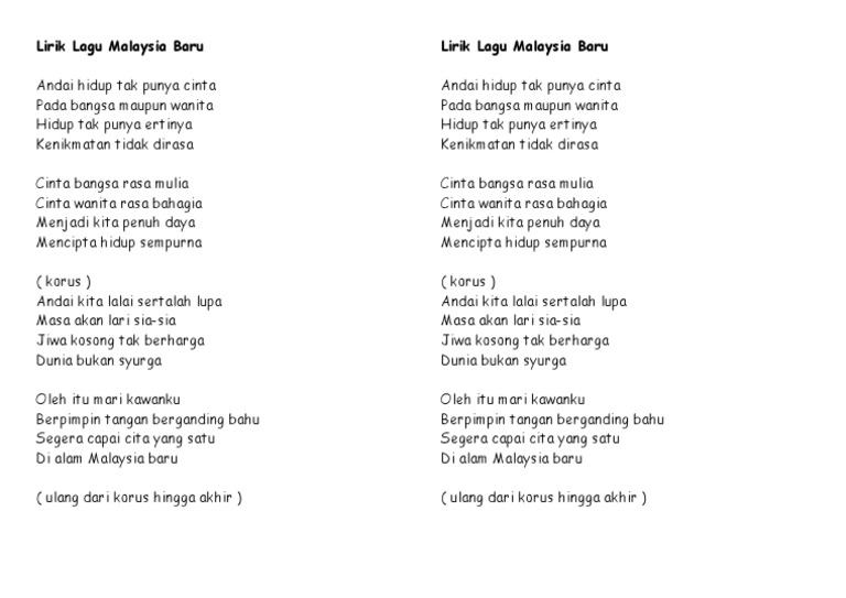 Bersinar di seluruh alamku gemilang cemerlang cahaya lahirnya di zaman dunia baru malaysia negara baru malaysia. Verse 1 dunia kian berubah perubahan melingkari melaksana hasrat hati kejayaan terbukti. You can streaming and download for free here! Andai hidup tak punya cinta pada bangsa maupun wanita hidup tak punya ertinya kenikmatan tidak dirasa. Lagu malaysia populer dan terbaik.