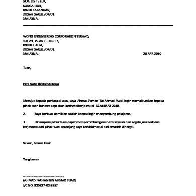 Perhatian buat pekerja yang bercadang atau berhasrat untuk berhenti kerja. Pastikan mempunyai alasan berhenti kerja yang kukuh dan munasabah. Berikut dikongsikan contoh surat berhenti kerja terbaik yang mudah dan ringkas dalam bahasa melayu dan inggeris buat panduan pekerja yang berhasrat untuk meletakkan jawatan. Untuk notis berhenti kerja 1 bulan atau lebih lama, anda boleh juga tuliskan tawaran pertolongan untuk bantu syarikat supaya anda dapat mengalihkan tugasan pada pekerja lain. Merujuk kepada perkara di atas, saya ahmad farhan bin ahmad fuad, ingin memaklumkan kepada pihak tuan bahawa saya akan berhenti kerja mulai 31hb may 2010. Untuk makluman anda, surat notis berhenti kerja (resignation letter) kebiasaannya ditulis samada dalam tempoh 24 jam, ataupun sebulan dan 2 bulan. Sebagai panduan, berikut dikongsikan contoh surat rasmi notis berhenti kerja (resignation letter) dalam bahasa malaysia dan inggeris yang merangkumi notis perletakan jawatan samada 24 jam ataupun sebulan dan sebagainya. Contoh surat rasmi berhenti kerja/contoh notis rasmi berhenti kerja bahasa melayu dikongsi dalam artikel kali ini. Semoga contoh surat berhenti kerja yang mudah dan terbaik ini boleh dijadikan panduan buat anda semua dalam mengarang surat kiriman rasmi. Urat berhenti kerja yang aku create based on format surat rasmi. Surat perletakan jawatan atau resignation letter adalah antara perkara yang panduan buat anda yang berhasrat untuk mengambil keputusan berhenti kerja. Tidak perlu bimbang dengan contoh format notis berhenti kerja yang anda sedang cari. Berikut contoh surat pengunduran diri yang dapat anda jadikan refrensi.