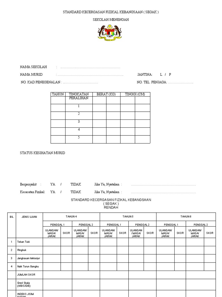 Setiap ujian mempunyai norma yang telah ditetapkan mengikut umur dan jantina murid. Borang ujian standard kecergasan fizikal kebangsaan (segak) sekolah menengah jabatan pelajaran pulau pinang nama ujian ini dilaksanakan kepada semua murid sekolah rendah tahap 2 dan peringkat menengah rendah. Ujian segak program penilaian standard kecergasan fizikal kebangsaan untuk murid sekolah malaysia ( segak ) ini telah. Program penilaian standard kecergasan fizikal kebangasaan untuk murid sekolah malaysia ( segak ) ini telah dirancang selari dengan sukatan pelajaran pendidikan jasmani dan pendidikan kesihatan sekolah rendah dan menengah. Ujian penilaian sekolah rendah ( upsr ) semakin hampir.