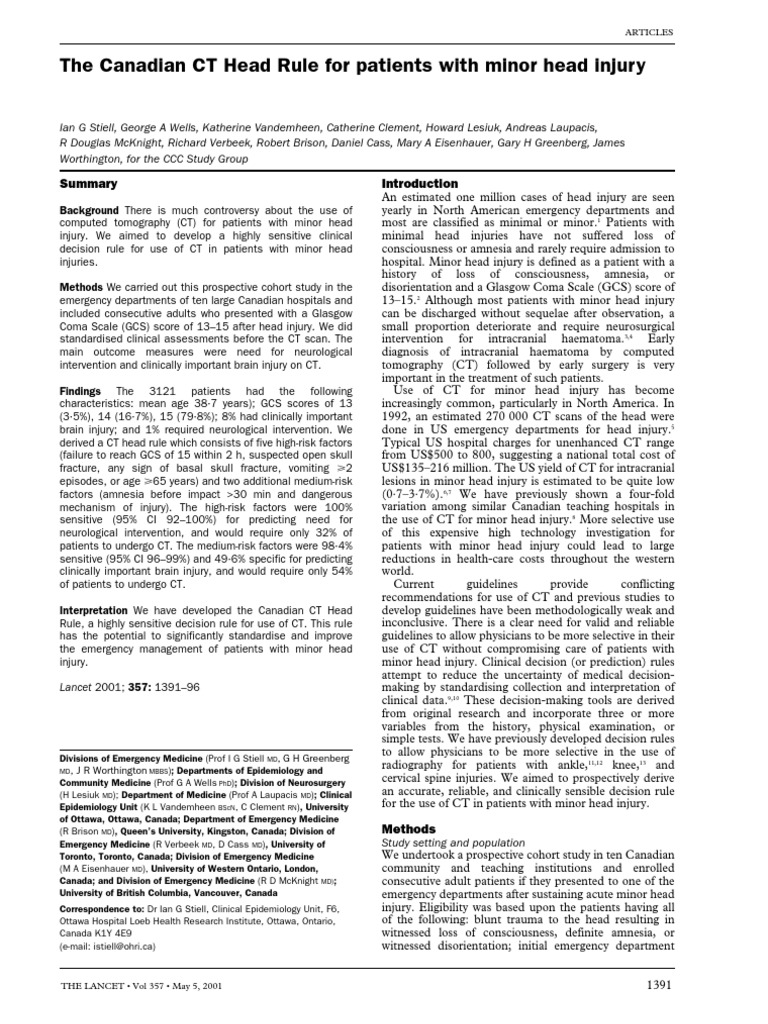 The canadian ct head injury group made up of emergency medicine leaders has focused on the usefulness of computed tomography (ct) in identifying potentially severe stiell and colleagues define the ct head rule as follows: